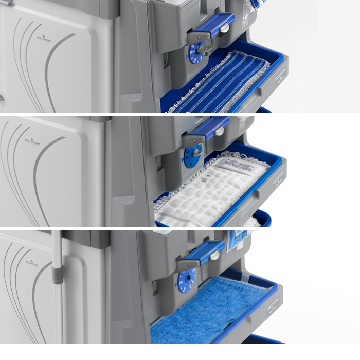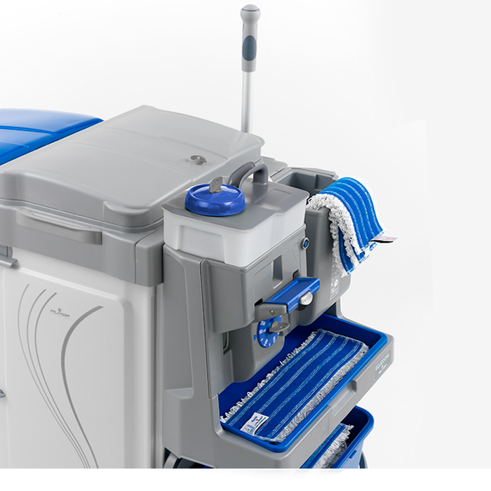 - Minimum overall dimensions: ideal in environments where there is a lack of big spaces to prepare and stock the pre-soaked mops and the hermetic buckets.