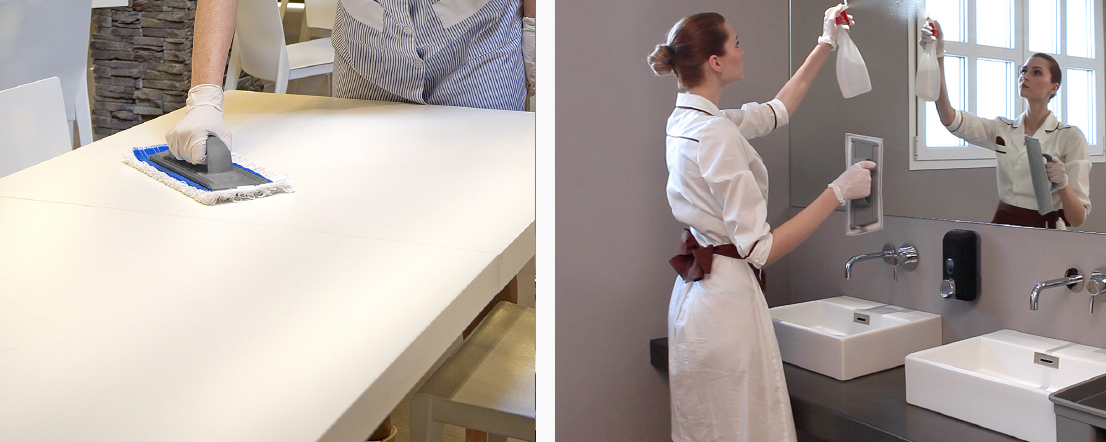 The Top-Clean and Brilliant systems share an ally: the practical mop holder with handgrip is used with Top-Clean system for cleaning tables, desks, and blackboards and with Brilliant system for cleaning interior glass, mirrors, stainless steel countertops, lacquered doors, and painted doors. Thus, the operator can use a single tool to easily clean several environments, getting optimal results anyway.