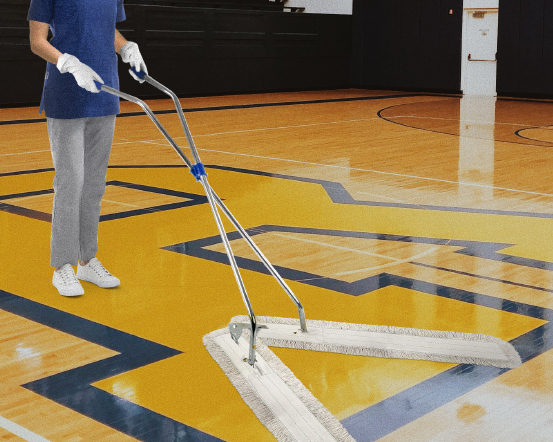 V-sweeper system consisting of a mop holder and a cotton mop is designed for dusting very large, obstacle-free indoor spaces such as the lobby and gymnasiums. The natural fiber mixed with thick yarn collects and traps dust and dirt, releasing them only when the textile is washed.