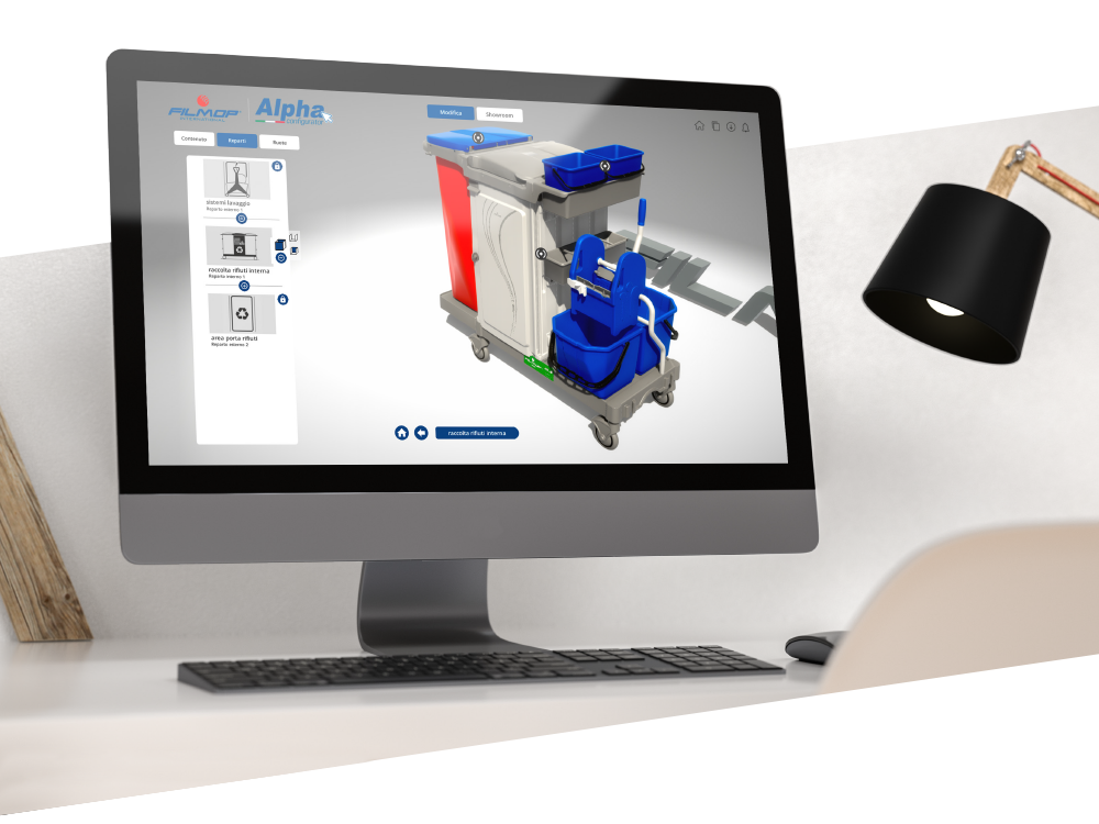Alpha Configurator is Filmop's application that allows you to create in a few simple steps a customized trolley, configured according to specific needs: the user can freely choose the number of compartments, washing systems, doors, accessories, colors and much more, thus creating the ideal trolley for every cleaning need.