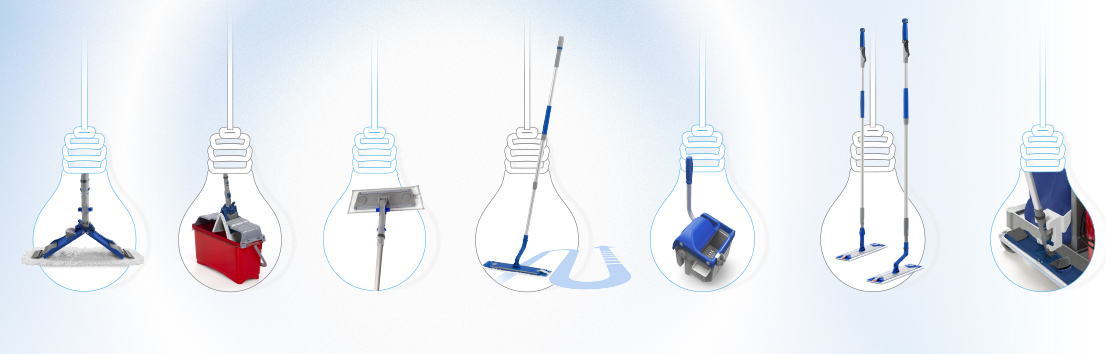 For example, Globo is the first and only universal cleaning system that can be used like any traditional system while achieving significantly superior results in terms of performance, hygiene, and ergonomics. Click Safe is another unique system that allows the mop to be detached directly into the bucket, avoiding any contact with bacteria and viruses. Among the patented systems particularly worthy of mention is Lock System, the innovative mechanism that can instantly lock and unlock the holder's joint, facilitating the cleaning of walls and ceilings. ErgoSwing also made history by making a significant contribution to operator well-being: the unique ergonomic system designed to follow the S-shaped movement minimises effort while increasing productivity. Boost, on the other hand, revolutionised wringing process, squeezing 20% more with half the effort compared to traditional wringers. Drop, on the other hand, stands out as a ready-to-use system that allows you to dose detergent solution as needed, preventing spillage thanks to its double safety lock.