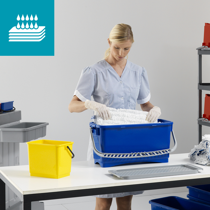 Pre-soaking mops is a key cleaning step that must be carried out according to a defined procedure using appropriate tools such as Top-Down buckets or special drawers.