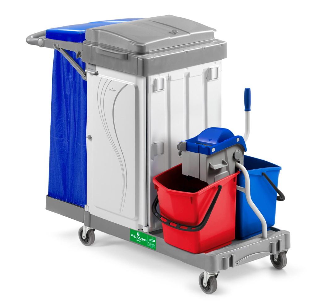 Multipurpose trolley, ideal for areas where dusting, waste collection, floor mopping and cleaning of surfaces are required.