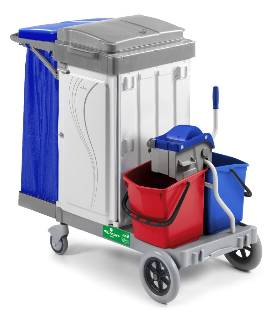 Multipurpose trolley, ideal for areas where dusting, waste collection, floor mopping and cleaning of surfaces are required.