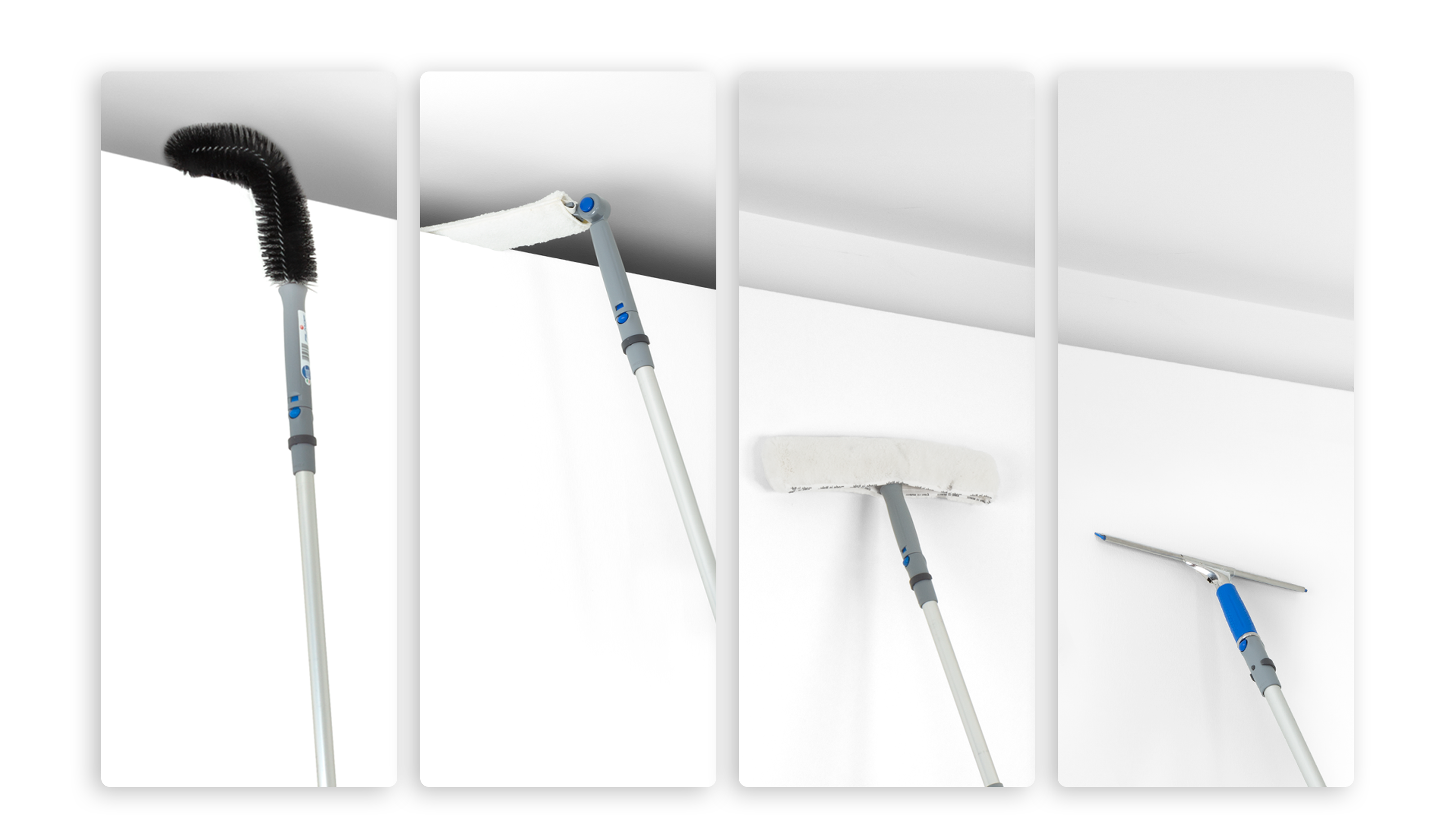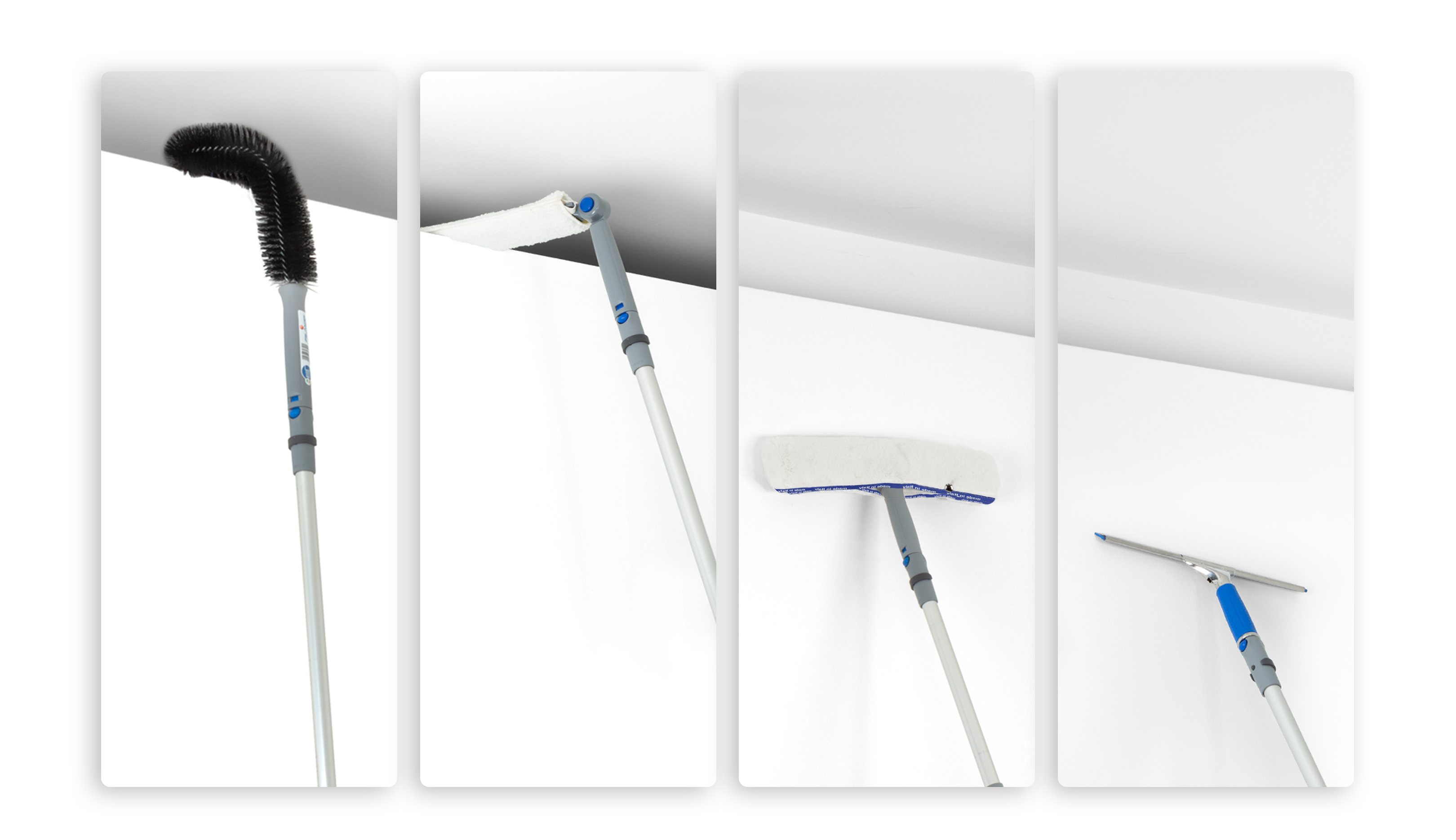 Windows squeegees and washers for glass cleaning, dusters and cobweb brushes for surface cleaning