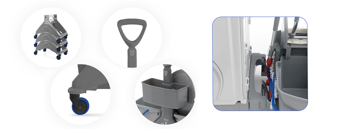 El carro OneFred está disponible en versiones con una bandeja portaobjectos para transportar el equipo necesario y con un soporte para escoba Peg Kit, que puede engancharse a los carros de línea Alpha y Morgan. Además, la gama especial se ha enriquecido recientemente con la nueva versión con enganche para el sistema Uni-Connect, que permite tener siempre a mano el equipo necesario, reduciendo al mínimo el espacio ocupado por el carro. Gracias a este exclusivo sistema, el operario puede soltar rápidamente el soporte de fregado en el enganche sin ningún contacto con la mano y, después, utilizar el mismo mango con otra herramienta para limpiar cristales y superficies, lo que hace que todo el proceso sea más eficaz.
