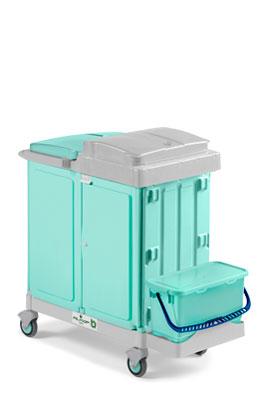 Il carrello Alpha A-B PLUS è realizzato con materiale plastico antibatterico riciclabile ed offre massima igiene e sicurezza grazie al sistema di chiusura dei vari reparti e la netta separazione delle zone di lavaggio, stoccaggio e raccolta.