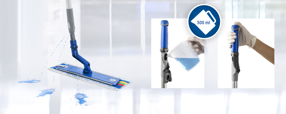 Mono-Tex è compatibile con ErgoDrop, il manico dosatore ergonomico con impugnature girevoli che garantisce elevate prestazioni, nessuno sforzo e un notevole risparmio di soluzione detergente in quanto può essere dosata in base alla superficie da pulire.