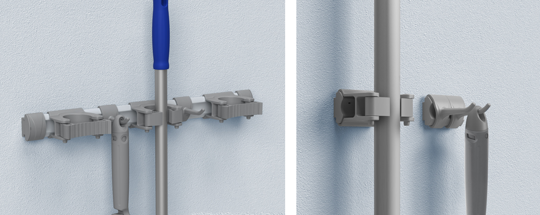 Ganci e portamanici sono disponibili anche nella versione progettata per il fissaggio a muro, particolarmente indicata per creare postazioni estremamente compatte.