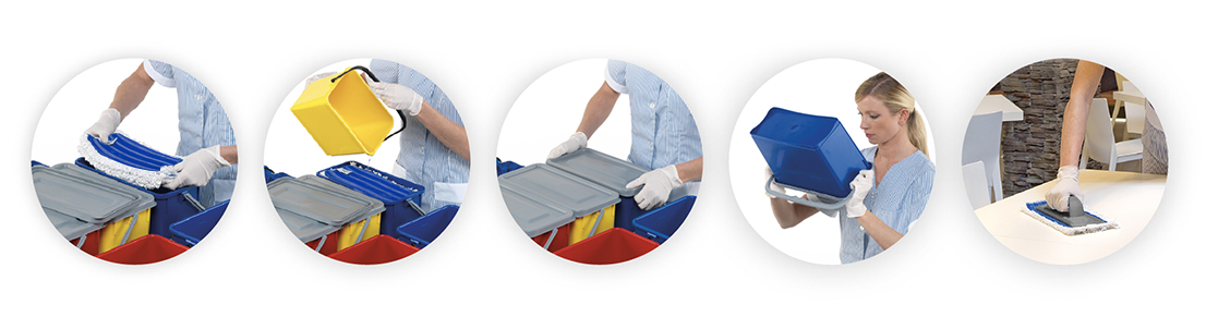 L’operazione di pre-impregnazione è semplice e si avvale del secchio ermetico Top-Down da 8 litri. Si inizia inserendo i panni da 30 cm nel secchio con il supporto a strappo rivolto verso l’alto, successivamente si procede versando la giusta quantità di soluzione detergente. A seguire è sufficiente chiudere il secchio con l’apposito coperchio ermetico, capovolgerlo un paio di volte e attendere 15 minuti prima di iniziare a pulire.